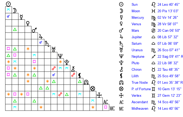 | Sun | 24 Leo 41 | 25 Leo 2 | 7 Libra 26 |