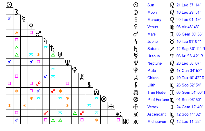| Neptune | 28 Leo 39 | 1 Aries 44 | 1 Virgo 20 |