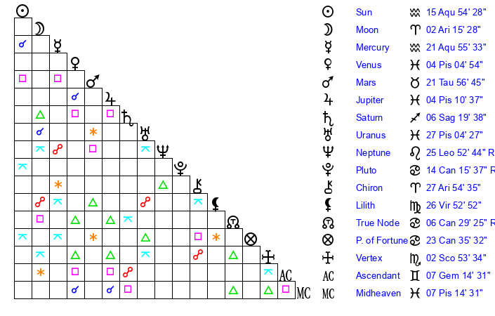 | Sun | 15 Aquarius 55 | 17 Aquarius 9 | 22 Taurus 54 |
