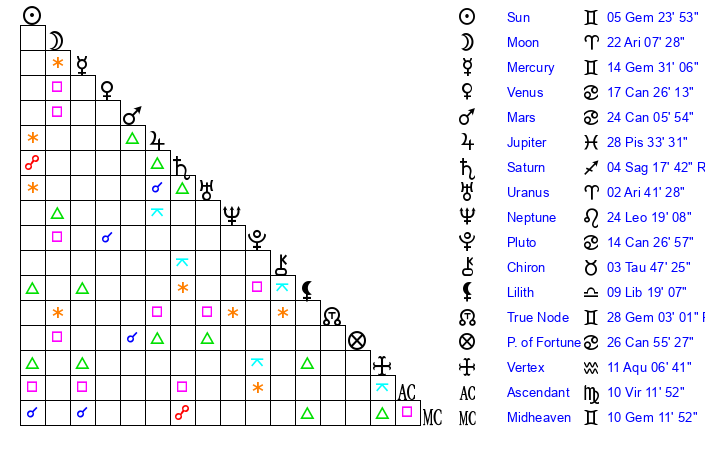 | Moon | 22 Aries 9 | 14 Gemini 53 | 19 Scorpio 59 |