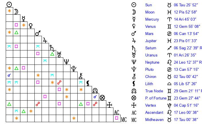 | Sun | 6 Taurus 26 | 7 Taurus 41 | 10 Leo 21 |