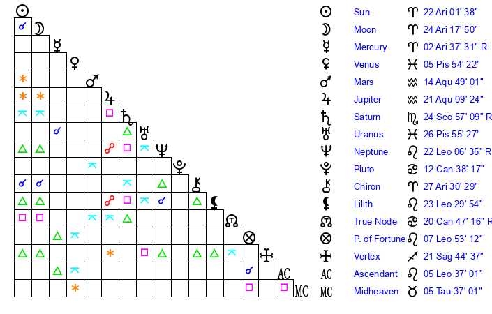 | Sun | 22 Aries 2 | 23 Aries 2 | 27 Cancer 12 |