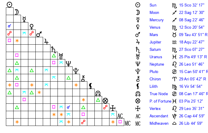 | Sun | 15 Scorpio 32 | 16 Scorpio 32 | 26 Aquarius 2 |