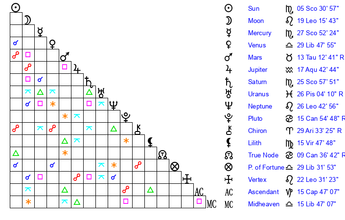 | Moon | 19 Leo 19 | 6 Aquarius 51 | 2 Aries 7 |