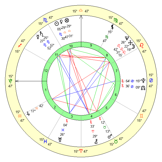 | Sun | 5 Scorpio 31 | 6 Scorpio 31 | 15 Aquarius 55 |
