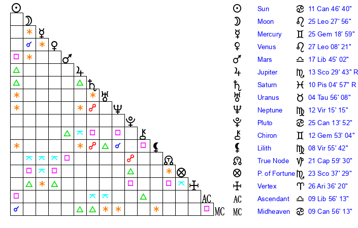 | Sun | 11 Cancer 46 | 12 Cancer 58 | 8 Libra 34 |