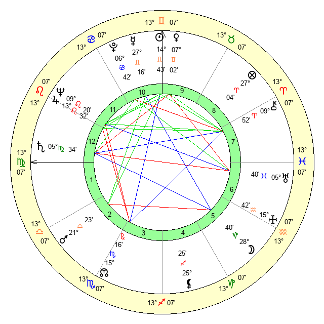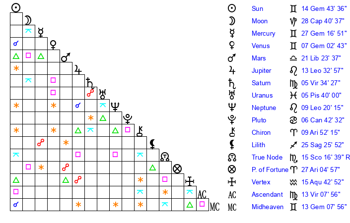 | Sun | 14 Gemini 43 | 15 Gemini 19 | 25 Virgo 30 |