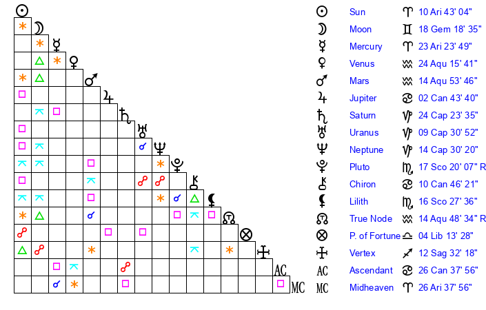 | Pluto | 17 Scorpio 19 | 3 Aquarius 32 | 16 Scorpio 26 |