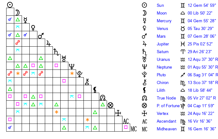 | Moon | 0 Libra 51 | 19 Virgo 43 | 27 Virgo 1 |