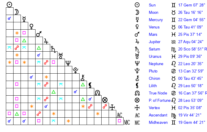 | Jupiter | 26 Aquarius 58 | 29 Gemini 44 | 18 Aquarius 30 |