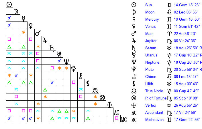 | Mercury | 19 Gemini 17 | 21 Gemini 7 | 11 Leo 49 |