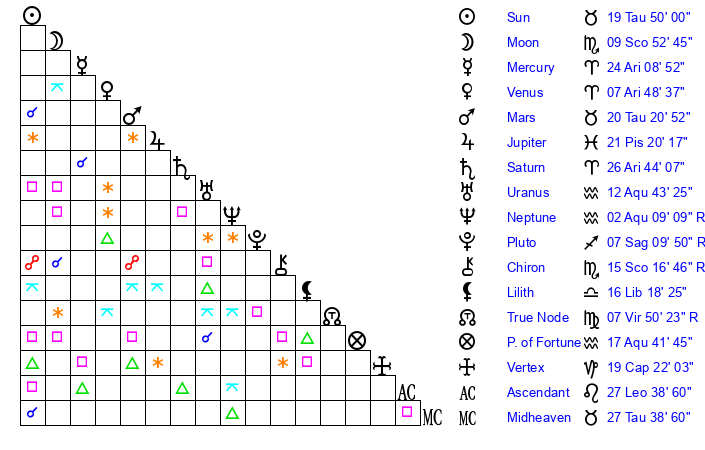 | Sun | 19 Taurus 50 | 20 Taurus 17 | 15 Gemini 47 |