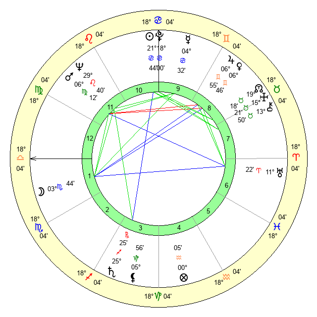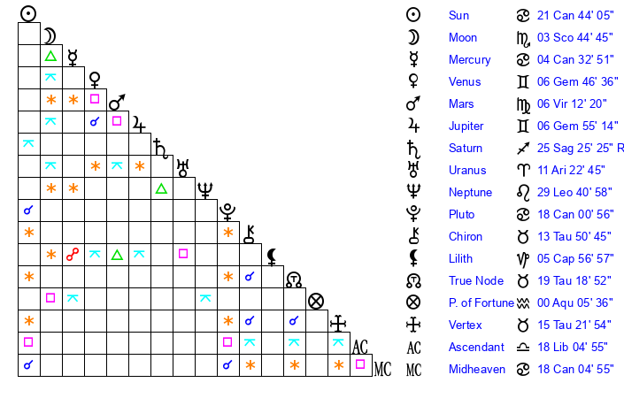 | Moon | 3 Scorpio 54 | 9 Pisces 42 | 27 Aries 24 |
