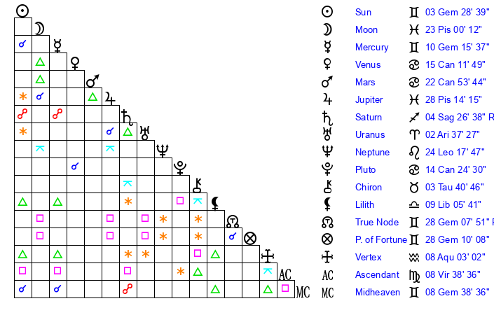 | Sun | 3 Gemini 29 | 4 Gemini 44 | 7 Virgo 17 |