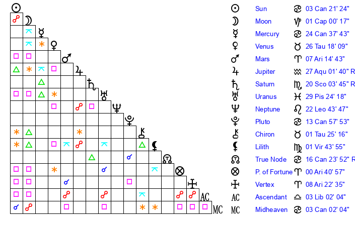| Pluto | 13 Cancer 58 | 3 Aquarius 14 | 15 Cancer 54 |