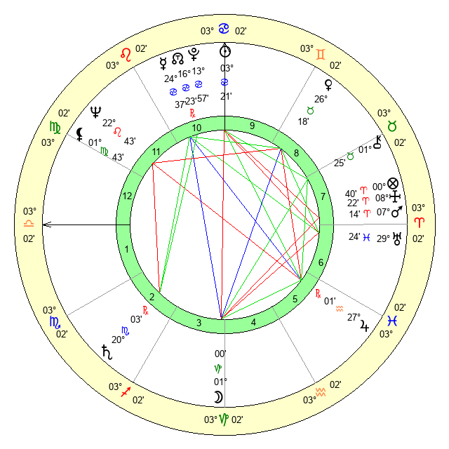 | Sun | 3 Cancer 21 | 4 Cancer 23 | 8 Libra 44 |