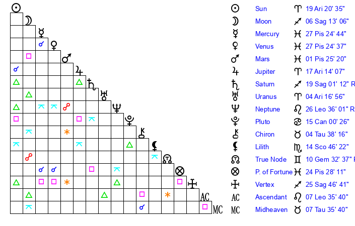 | Saturn | 19 Sagittarius 24 | 25 Pisces 24 | 13 Sagittarius 44 |