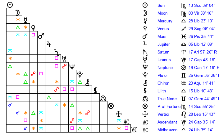 | Sun | 13 Scorpio 39 | 14 Scorpio 32 | 11 Pisces 15 |