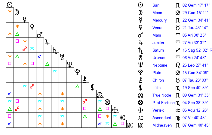 | Sun | 2 Gemini 17 | 2 Gemini 49 | 5 Virgo 7 |