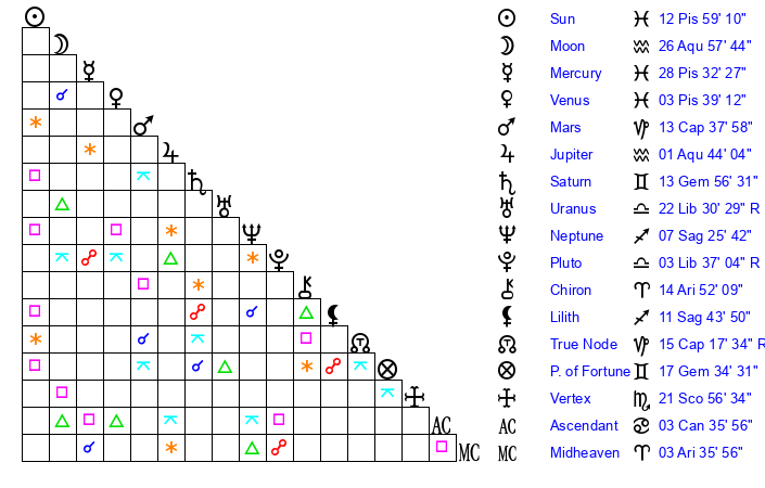 | Sun | 12 Pisces 59 | 13 Pisces 22 | 4 Taurus 21 |