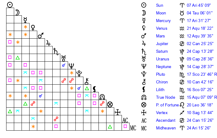 | Mars | 12 Aquarius 39 | 22 Cancer 34 | 8 Pisces 48 |