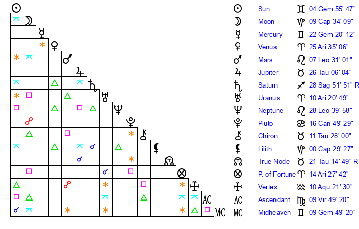 | Mercury | 22 Gemini 20 | 1 Gemini 27 | 0 Libra 38 |