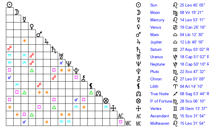 | Mercury | 14 Leo 53 | 7 Leo 28 | 13 Libra 24 |