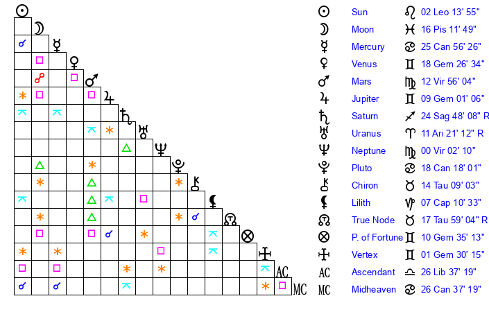 | Moon | 16 Pisces 14 | 14 Leo 26 | 1 Libra 46 |
