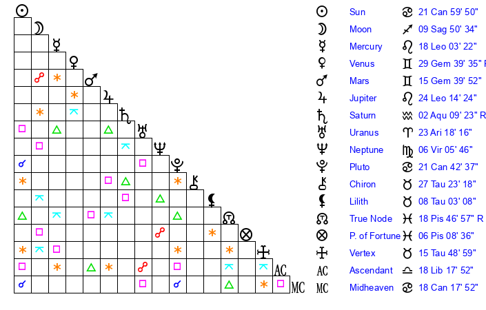 | Moon | 9 Sagittarius 51 | 9 Pisces 42 | 4 Taurus 44 |