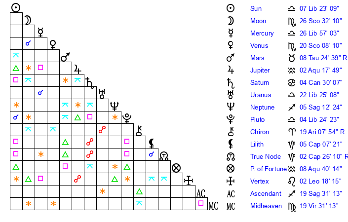 | Moon | 26 Scorpio 39 | 15 Capricorn 51 | 23 Libra 29 |