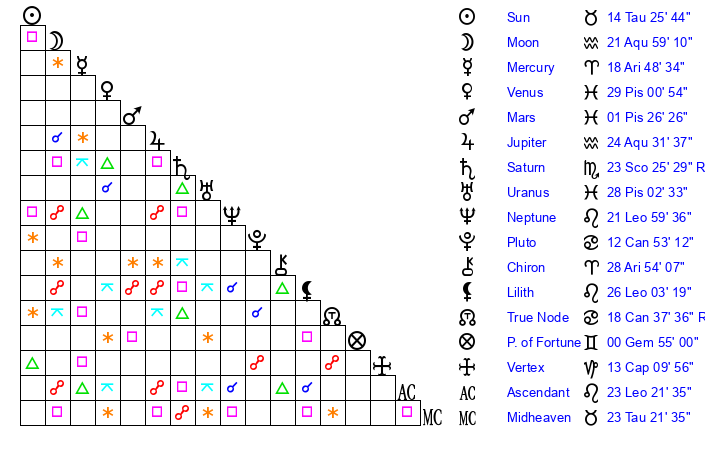 | Neptune | 21 Leo 59 | 1 Aries 14 | 24 Leo 19 |