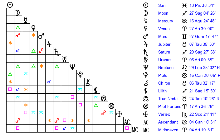 | Saturn | 29 Sagittarius 47 | 21 Pisces 4 | 28 Sagittarius 20 |