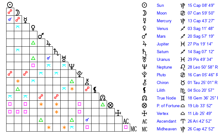 | Pluto | 16 Cancer 6 | 2 Aquarius 53 | 15 Cancer 2 |