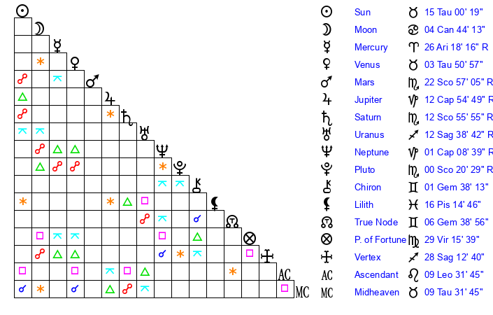 | Sun | 15 Taurus 0 | 15 Taurus 5 | 24 Gemini 24 |