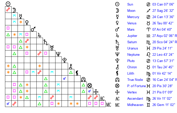 | Jupiter | 26 Aquarius 56 | 3 Cancer 33 | 17 Aquarius 26 |
