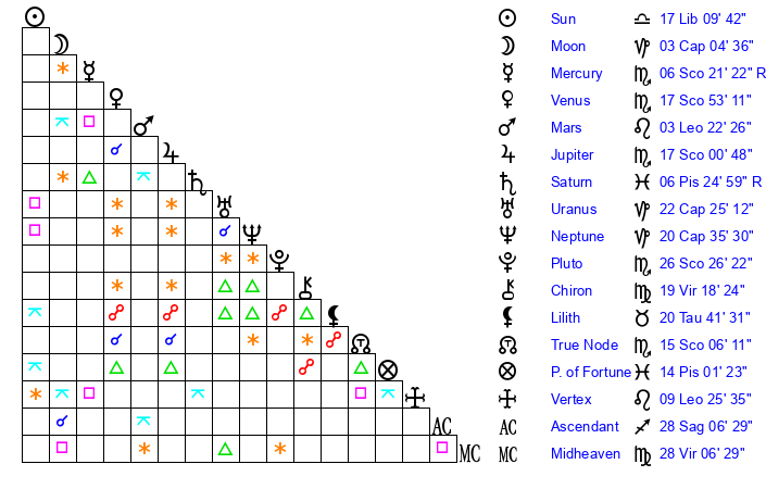 | Sun | 17 Libra 9 | 17 Libra 38 | 18 Scorpio 4 |