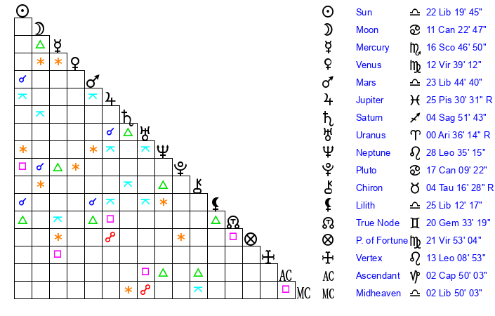 | Sun | 22 Libra 20 | 23 Libra 35 | 1 Aquarius 27 |