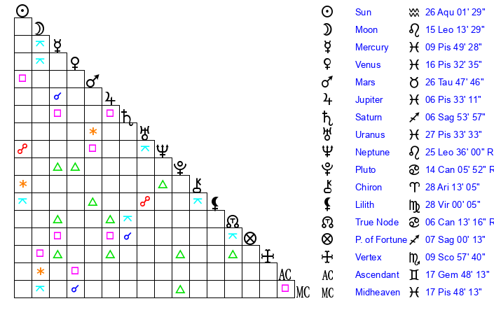 | Sun | 26 Aquarius 2 | 27 Aquarius 16 | 2 Gemini 31 |