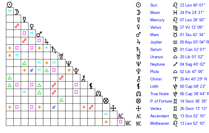 | Sun | 23 Leo 40 | 24 Leo 5 | 14 Libra 17 |