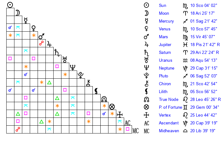 | Sun | 10 Scorpio 4 | 10 Scorpio 31 | 7 Sagittarius 16 |