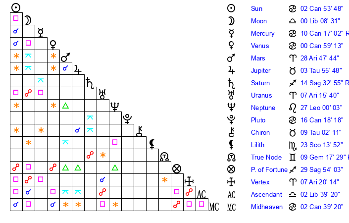 | Pluto | 16 Cancer 19 | 3 Aquarius 15 | 18 Cancer 19 |
