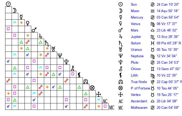 | Pluto | 25 Cancer 34 | 2 Aquarius 45 | 27 Cancer 21 |
