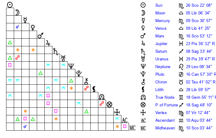 | Sun | 26 Scorpio 22 | 27 Scorpio 37 | 5 Pisces 52 |