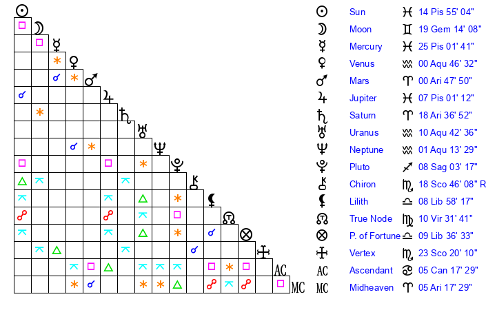 | Sun | 14 Pisces 55 | 15 Pisces 22 | 11 Aries 46 |