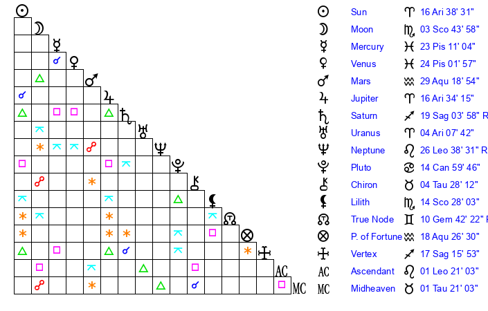 | Neptune | 26 Leo 39 | 0 Aries 16 | 27 Leo 30 |