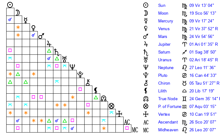 | Sun | 9 Virgo 13 | 10 Virgo 28 | 16 Sagittarius 38 |