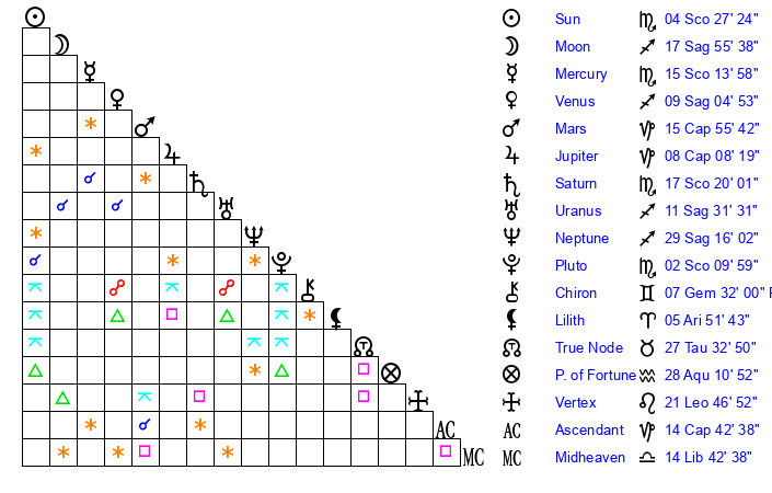 | Saturn | 17 Scorpio 37 | 25 Pisces 54 | 22 Scorpio 27 |