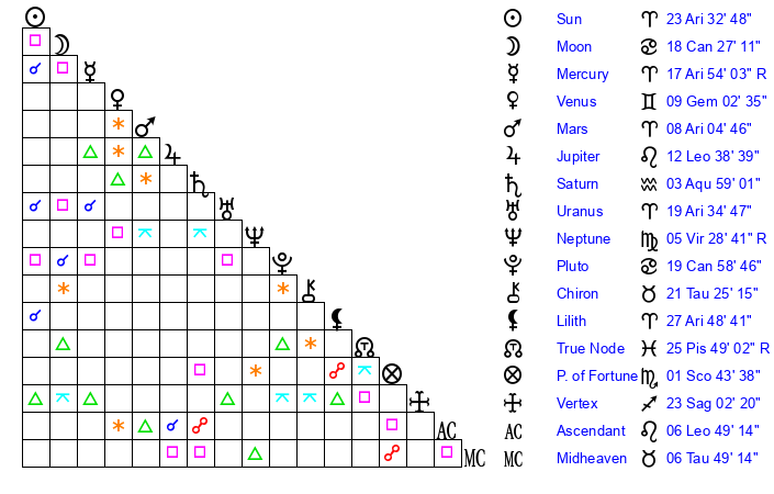 | Sun | 23 Aries 33 | 24 Aries 1 | 22 Cancer 57 |