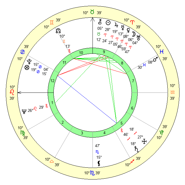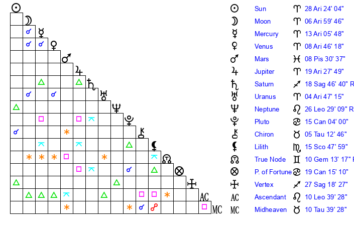 | Sun | 28 Aries 24 | 28 Aries 54 | 1 Leo 30 |