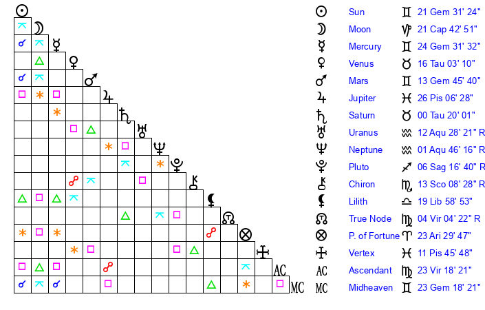 | Moon | 21 Capricorn 48 | 7 Capricorn 55 | 17 Capricorn 50 |